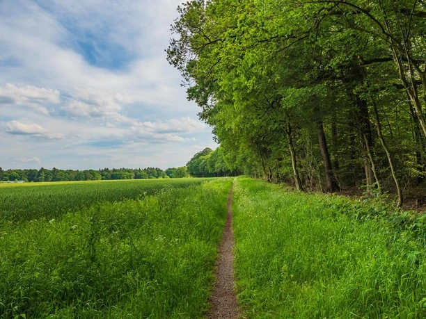 führt. Dies ist eine Teichanlage, die wie ein kleiner Park anmutet. Über den Kuhhornsweg, der wieder durch Wiesen und Felder vorbei an Bauernhöfen führt, geht es bis zum Dingsfelder Weg und diesem